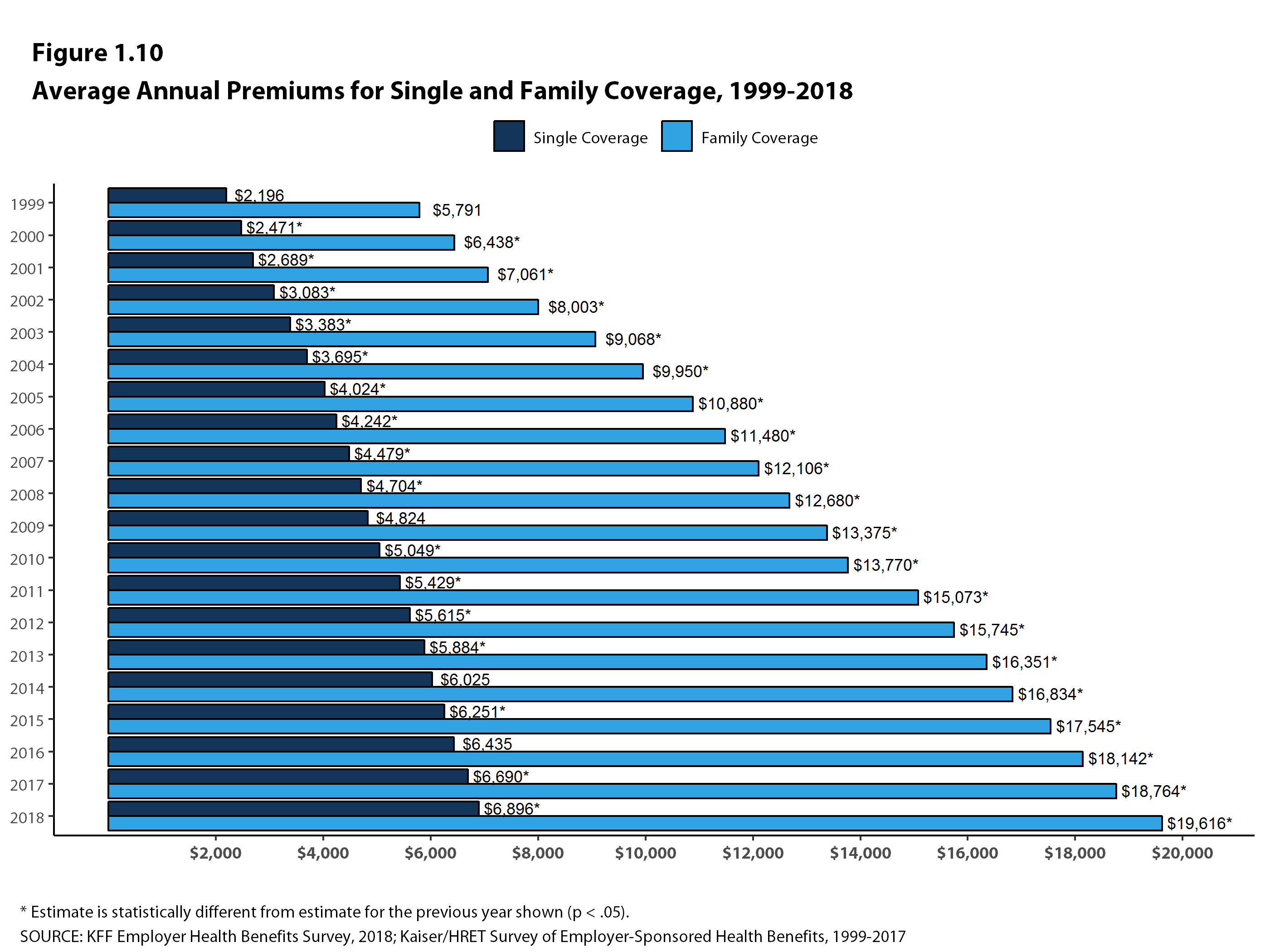 Average Annual Premiums for Single and Family Coverage, 1999-2018 (Kaiser Family Foundation)